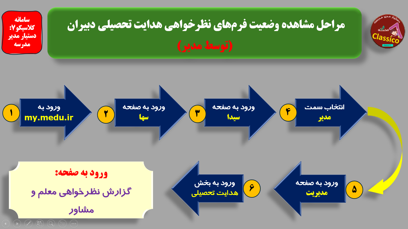 مراحل مشاهده وضعیت فرمهای نظرخواهی هدایت تحصیلی دبیران 🧭 مراحل مشاهده وضعیت فرمهای نظرخواهی هدایت تحصیلی دبیران (توسط مدیر) 1️⃣ ورود به my.medu.ir 🌐 برچسبها: رتبه بندی, کلاسیکو7, مدرسه هوشمند |