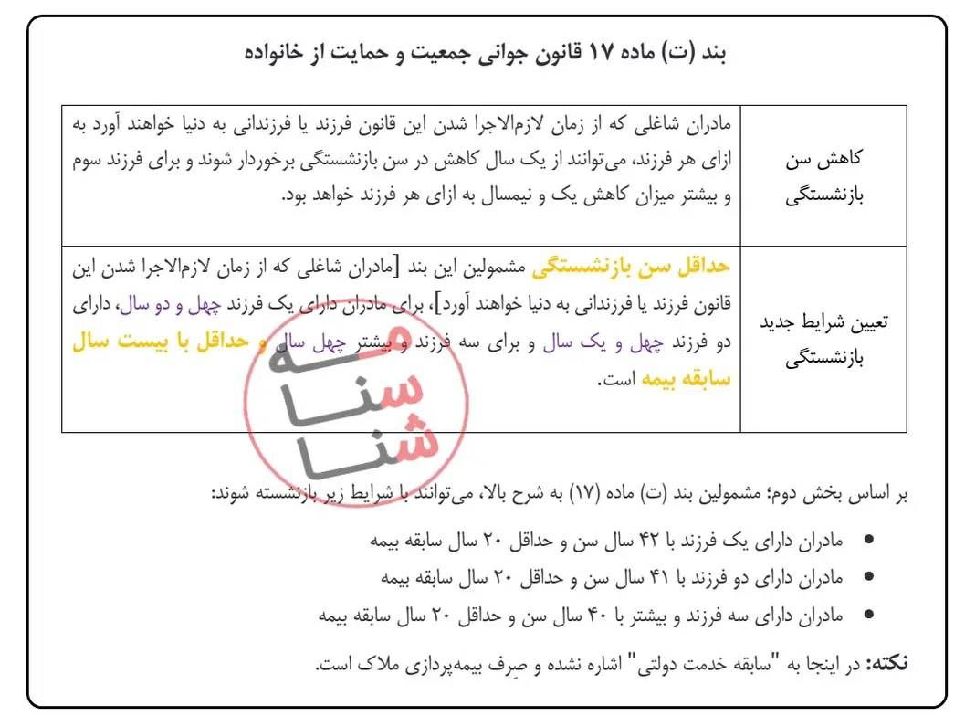 جدول شرایط بازنشستگی مادران شاغل مطابق بند ت ماده ۱۷ قانون حمایت از خانواده و جوانی جمعیت